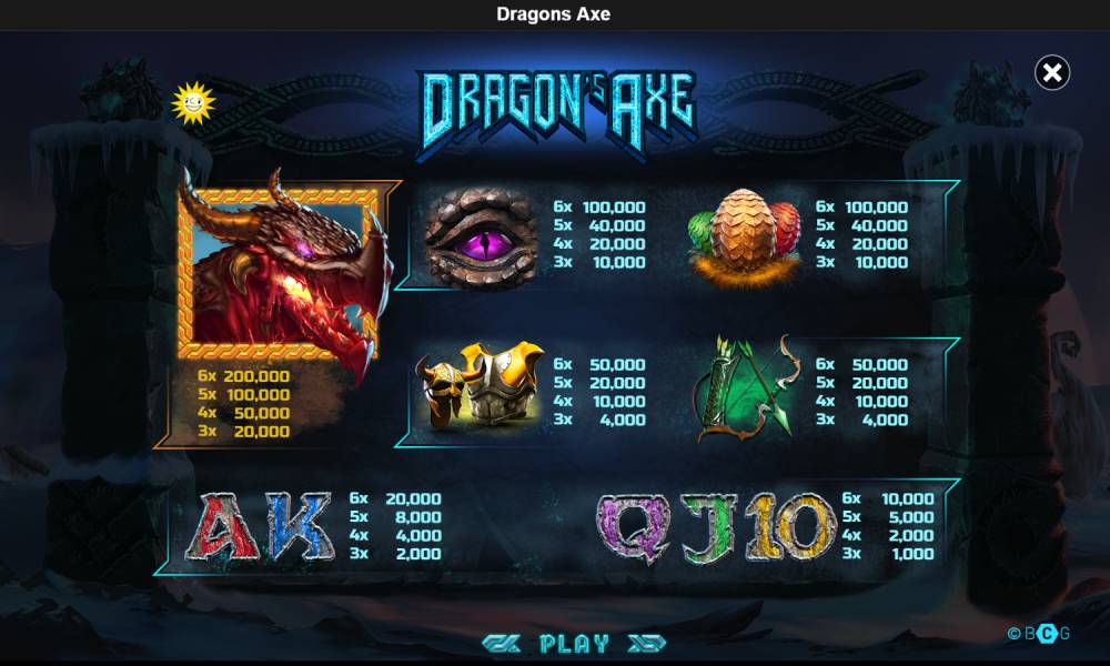 The playing field of Dragon's Axe slot is a 6×4 grid with 4096 possible winning combinations. The game uses 10 regular symbols, divided into two groups: high-paying and low-paying. Valuable symbols include a dragon, its eye, eggs, armor and bow and quiver. The less valuable symbols are represented by the A-10 cards. To win, you need to collect a minimum of three identical symbols on adjacent reels, starting from the leftmost one. Table The Dragon's Axe payout table is dynamic and its values are automatically recalculated depending on the current bet. depending on the current bet. This makes the gameplay flexible and allows you to adapt the strategy to your own style of play.