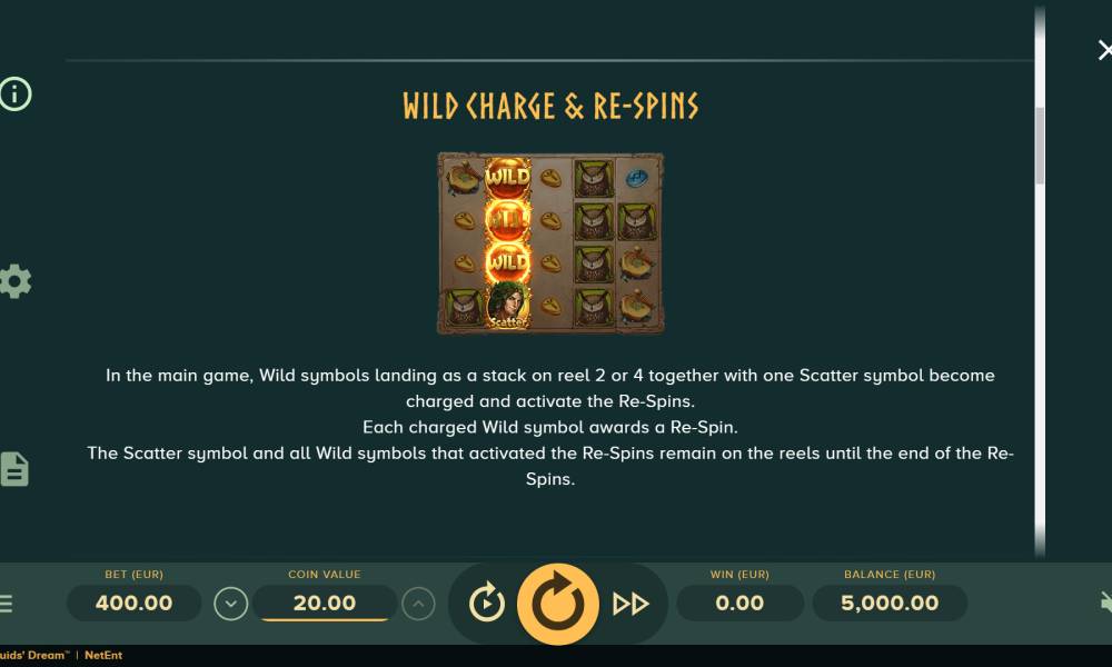 Druids’ Dream is a video slot that features 5 reels and 40 fixed paylines across a 20-symbol matrix.