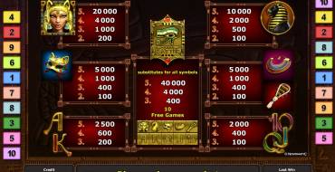 The gaming symbols, which you will see at the screen of this slot, are related to the history and culture of Egypt. Card signs from ten to ace are also imaged at the reels.