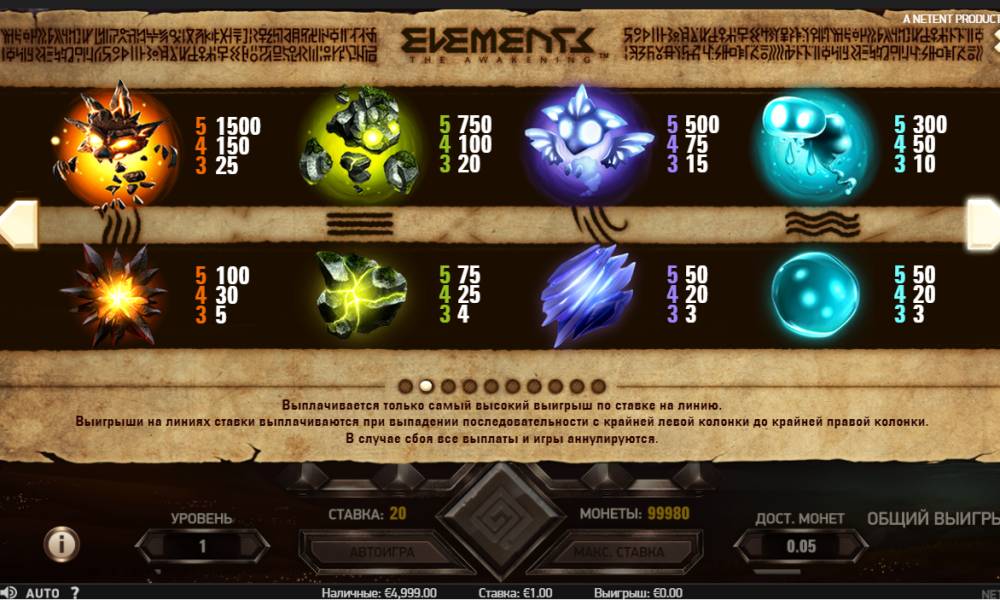 On each line can not be more than one paid combination. Winning is only for the oldest of them. There is no risky doubling game in Elements: The Awakening, so all payouts are summed up and immediately transferred to the account.