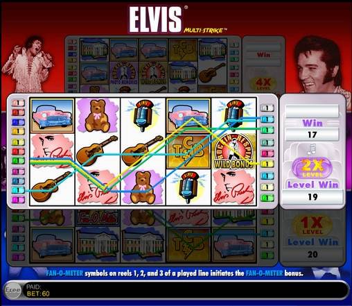 Elvis Multi-Strike slot machine has five reels and sixty paylines. The acceptable bet per each of them is in range from one to five coins of the value, stated by the rules of an online casino.