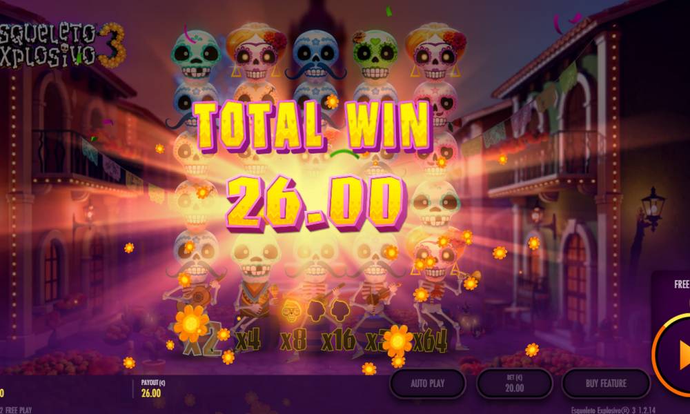 Thunderkick has given an original interpretation to the traditional celebration of the Day of the Dead in its Esqueleto Explosivo 3 online slot. The game does not allow you to be sad, it features cute skeletons changing skulls, playing musical instruments and singing. The extravaganza is accompanied by exploding Wild symbols, cascading payouts, increasing multipliers and free spins with repeats, which promises big wins up to a maximum of 7,500 times your bet.