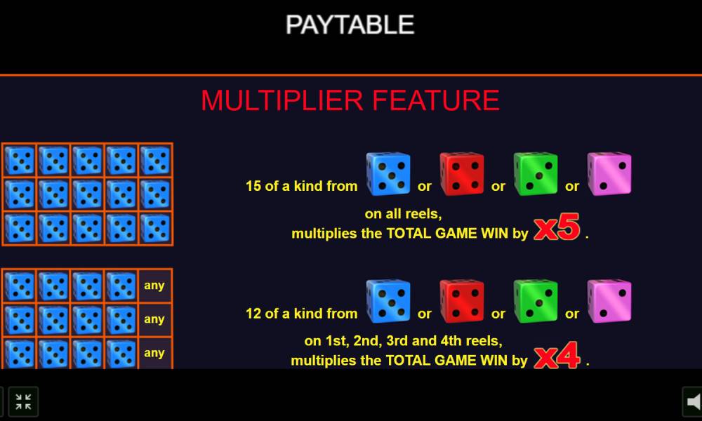 • Multiplier Feature. If one of the lower symbols completely covers the first three reels, the line wins are multiplied by 3. If four reels are filled, Multiplier x4 will be applied. If the entire field is covered with one symbol, then Multiplier x5 applies to all payouts on 5 lines. This feature works only for dice with 2, 3, 4 and 5 dots, that is for younger signs.