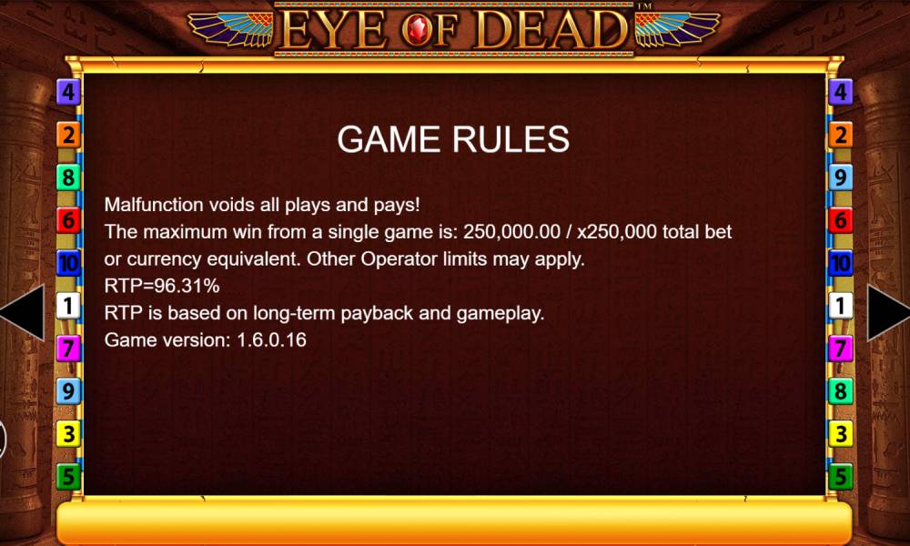 The Eye of Dead slot immerses players in the atmosphere of ancient Egypt, where hidden tombs and curses of pharaohs come to life on the reels. In the center of the plot - a mysterious artifact that opens the gate to treasures and ancient secrets. Symbolism of the slot is thematic: scarabs, statues of the gods and the Book with the eye of the dead man. They give not only visual pleasure, but also generous winnings. Online slot has a good technical characteristics, so you will not have to play at a disadvantage. And if you're patient, you'll be able to win big in the free spins round thanks to the symbol transformation feature.