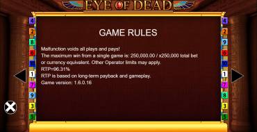 Play the Eye of Dead slot by Blueprint Gaming at a reputable casino. Then you won't have to worry that your personal data will get to scammers, and access to your account will be closed at one moment. After all, reliable casinos use modern encryption and protection systems, ensuring the privacy of clients.