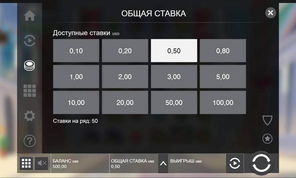 The interface of the slot is simple. The main menu and control buttons are at the central part. The settings, volume, and opening the slot to full-screen buttons are at the top. The free spins paid activation button is on the left.