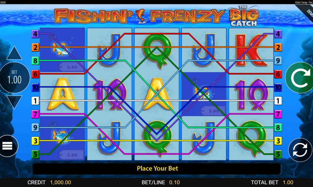 The Fishin Frenzy The Big Catch slot from the provider Blueprint has classical playing field, which consists of 5 reels with 3 symbols each. All payouts are made on 10 paylines.
