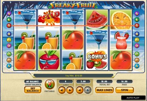 The bonus game of Freaky Fruit slot machine is named Tropical Cocktail. An amount of the payoff in this round depends on quantity of Bonus symbols in the combination, which has triggered it. In case there were three of them, the winning can reach 640 bets per line, for four symbols you get 3200 bets, while the combination of five symbols is granted with 16000 bets. The game is user-friendly, so we wouldn't describe it in details to save an intrigue.