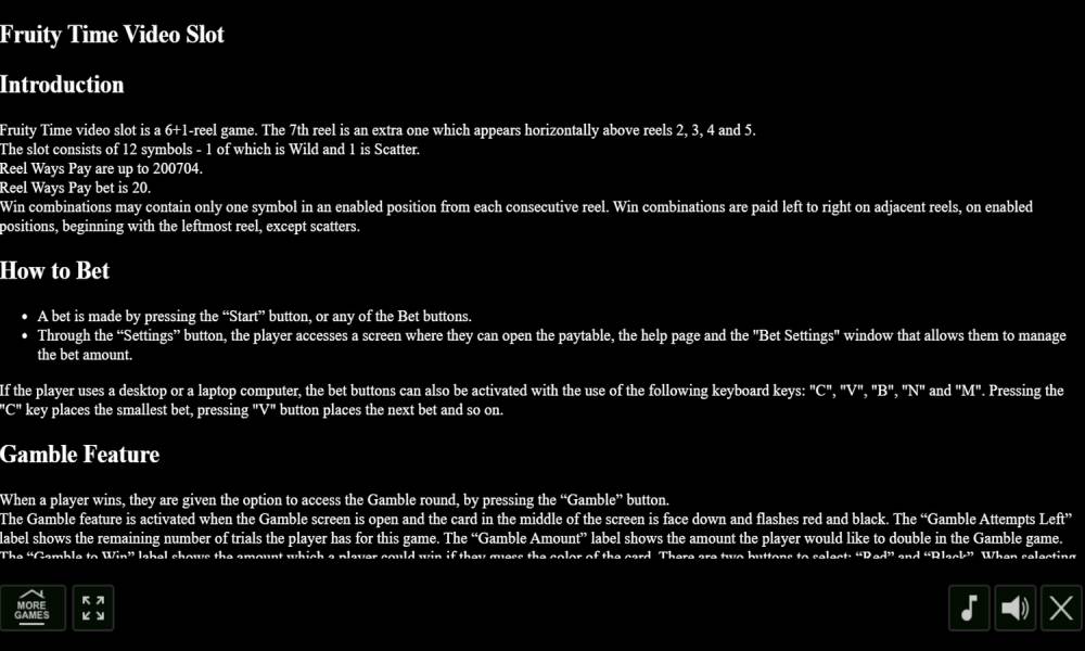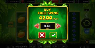 Fruity Time slot machine has 6 vertical reels and 1 horizontal reel. The playing field can vary from 2x3x3x3x3x3x2 to 7x8x8x8x8x8x7, depending on how many symbols fall on the columns. In total, there are 4 low, 4 medium and 2 high paying types of symbols in the game. All of them make combinations of 3-6 pieces on the field. Chains collected from the first reel in a row are counted. This gives 200704 lines to win at most. The game features free spins, Jackpot Cards and Gamble rounds. There is also a purchase bonus, which allows you to take matters into your own hands rather than waiting for luck. The betting range is large from 0.01 to €1,000.