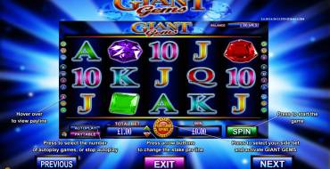 A gambling feature is not provided by the rules of «Giant Gems» video slot. Exceptions from the general rules and special features are discussed below in the review.