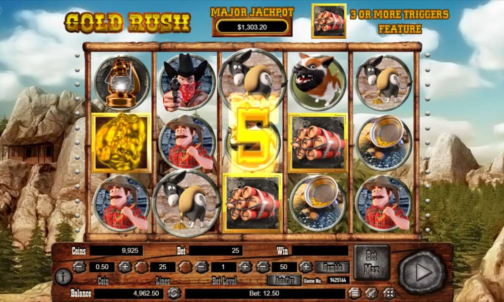 «Gold Rush» video slot has five reels, twenty five pay lines, always active on default, and fifteen symbols at the screen, located in three rows.