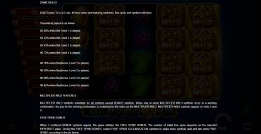 The interface of the Gold Tracker 7s is as simple as possible - the developers didn't even bother to decorate it and come up with an unusual design. To the left of the field displays the size of payouts for Cashpot in different amounts. All other elements are collected at the bottom. On the left is the menu and Buy Bonus. On the right are the buttons for launch, autospin, accelerate spins and change the bet. And here is a set of recommendations that everyone better apply before starting to play Gold Tracker 7s: