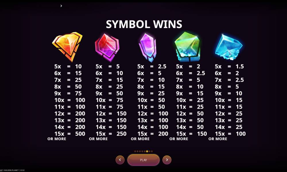 The Golden Planet slot machine from the Red Tiger provider has a standard playing field, consisting of 5 reels with 5 symbols. Payouts are made on the Cluster Pays system.