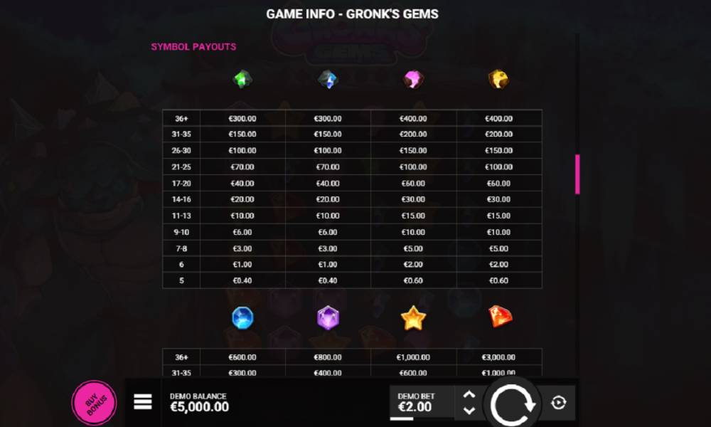 According to Casinoz, the Gronk's Gems is a balanced slot with unique features and impressive graphics. The game is suitable for all levels of users, offering both moderate winnings and the possibility of a big payout.