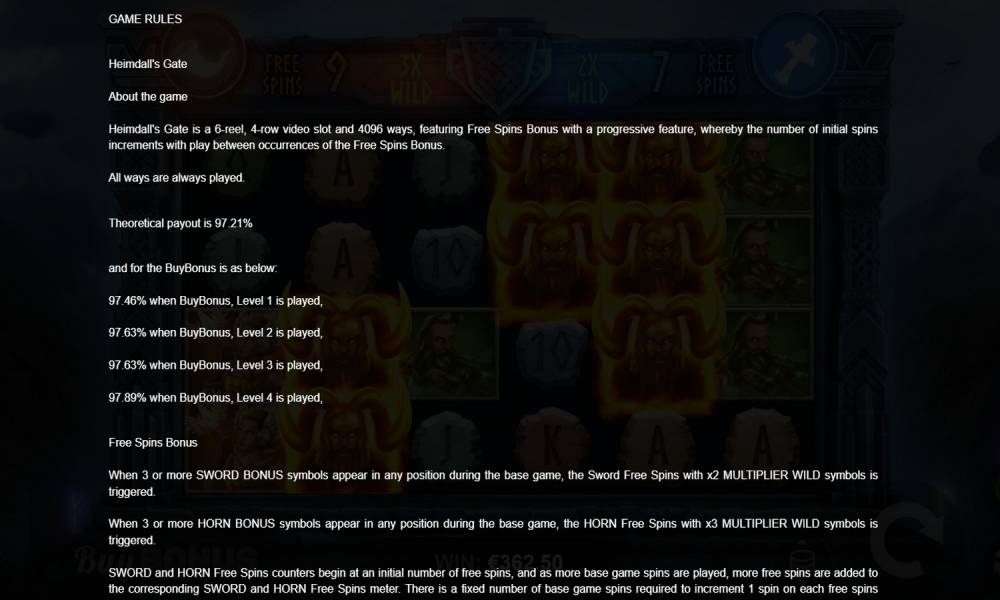 The slot has a design in somber calm colors. The field is beautifully framed with a decorative frame in the theme of Scandinavian mythology. Above it are built in 2 Free Spins Counters. In the center under the field highlights the size of the payout, which is received in the current spin (if any). On the left in the corner - Buy Bonus and menu buttons are located, and the balance is displayed. On the bottom right 4 buttons are collected: launches (manual and auto), bet selection and speed up/slow down spins. Autospins have no settings to stop, you can start and deactivate this mode only by pressing the button. And here are some tips that will come in handy for the gambler who decided to play Heimdall's Gate: