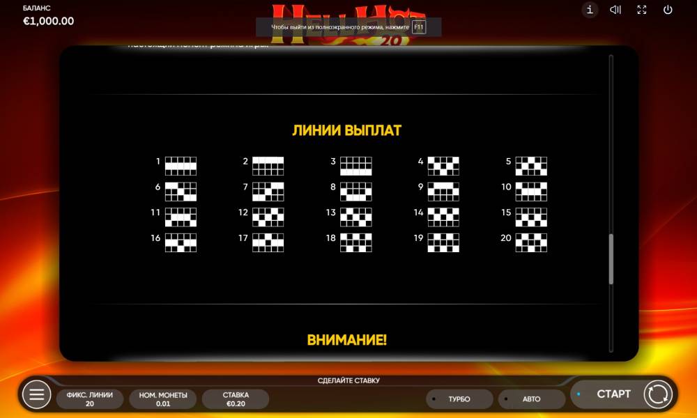 The playing field of the slot Hell Hot 20 from the provider Endorphina is standard. It consists of 5 reels with 3 symbols in each. Payouts are made on 20 fixed lines, the number of which can be changed.