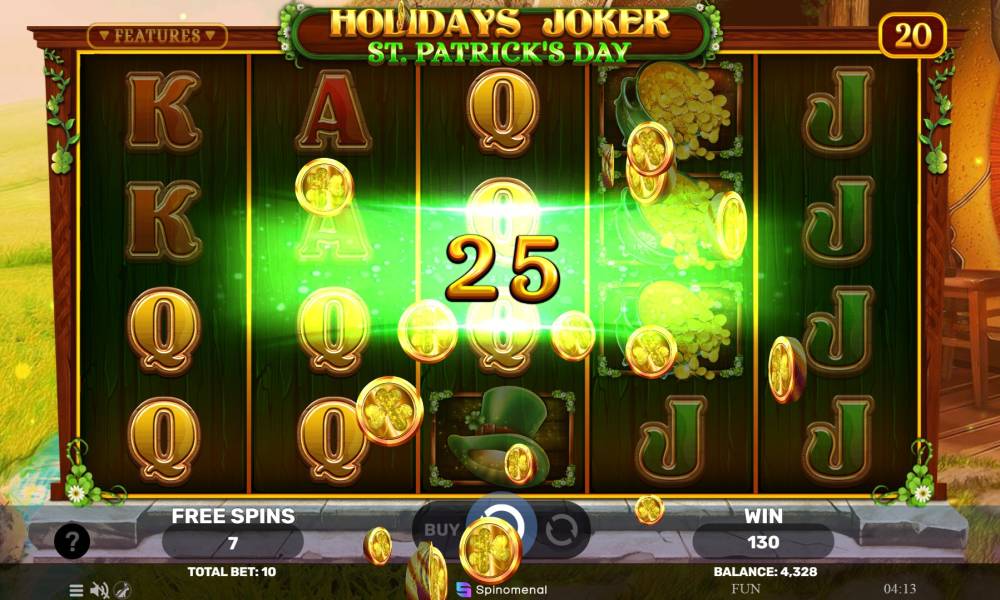 The excellent Holidays Joker - St. Patrick's Day slot from Spinomenal is dedicated to the celebration of St. Patrick's Day. The provider has added a typical Irish entourage in the form of a pot of gold, good luck symbols and generously scattered clover leaves across the playing field. High-quality graphics attracts the eye and gives a lot of aesthetic pleasure.