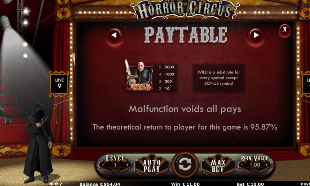 Join Games company invites you to the unusual circus where scary artists perform. Their images make even the most strong-nerve people shake time after time. Nothing to say that kids, pregnant women, elderly people and weak-heath ones have nothing to do at this show. If you are brave and courageous enough, launch «Horror Circus» slot machine and enjoy the impressive performance.