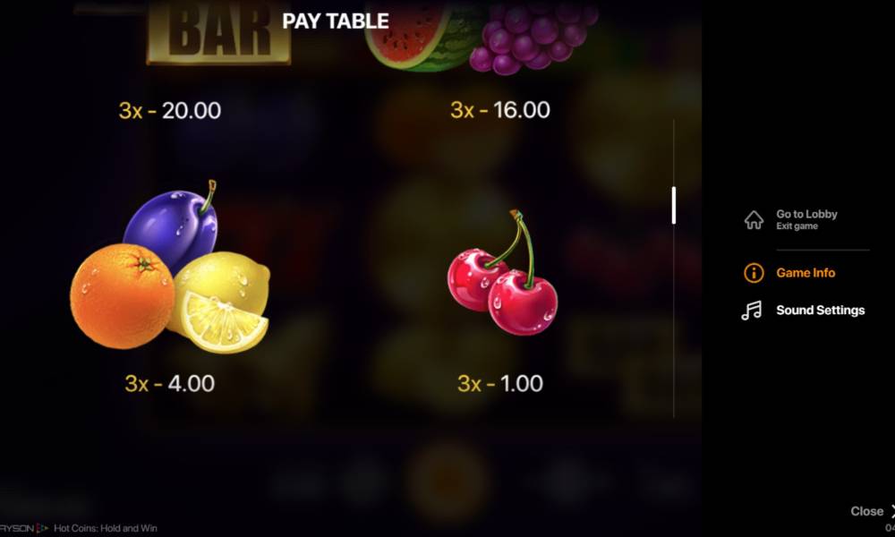 After learning the features of the slot and its functionality, you can start paying real money and enjoy real winnings. Hot Coins Hold and Win slot machine is available at different online casinos in the list below. All of them are licensed and guarantee fair play. Before you play, check out the pay table, which contains a lot of information about winning combinations.