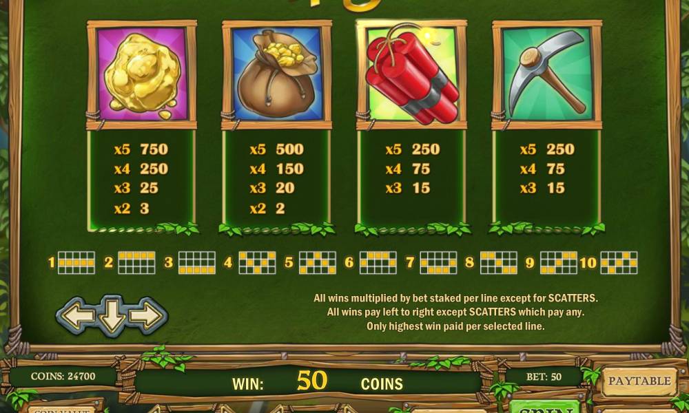 Except the main heroes, you can see golden bars, a miner’s pick, dynamite, a bag of coins and colorful card signs from ten to ace at the screen.