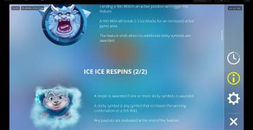 Ice Ice Respins is activated by the Yeti Wild symbol. Yeti breaks 2-3 ice blocks and triggers a respin. Each additional winning symbol triggers a new respin and breaks more blocks, increasing the number of paylines to a maximum of 16,807.