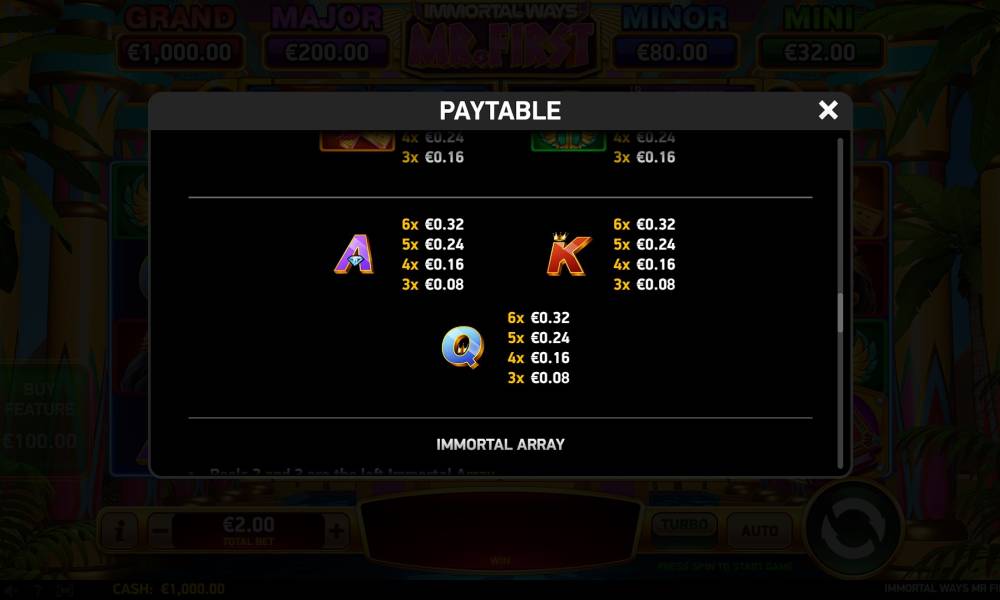 Buy Feature. This is where you can buy free spins. And the Immortal Ways Mr. First is the only (as of July 2024) slot in the Immortal Ways series that has this feature.