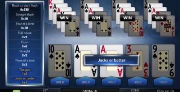 The panel has a convenient system that allows selecting the number of active hands, bet sizes in coins, and coin values. There is also a button that allows making the highest possible bet (Max Bet). A round button in the middle is multifunctional. It starts a new round, activates the exchange of cards (users firstly need to select cards that will be held by clicking on them with the mouse), and transfers winnings to the account. To the left of the screen there is a paytable that displays payouts for hands calculated for the current bet. Payouts are shown in coins in the standard table (it is located above the cards while playing one hand and is opened by I if you play a few hands.) Options allow activating a game on equal chances, selecting a graphics quality, and turning off various audio effects. The section Help provides detailed information about rules, interface, and other aspects of this model. There is no sense in downloading Jacks or Better Double Up. Run it directly in the browser.