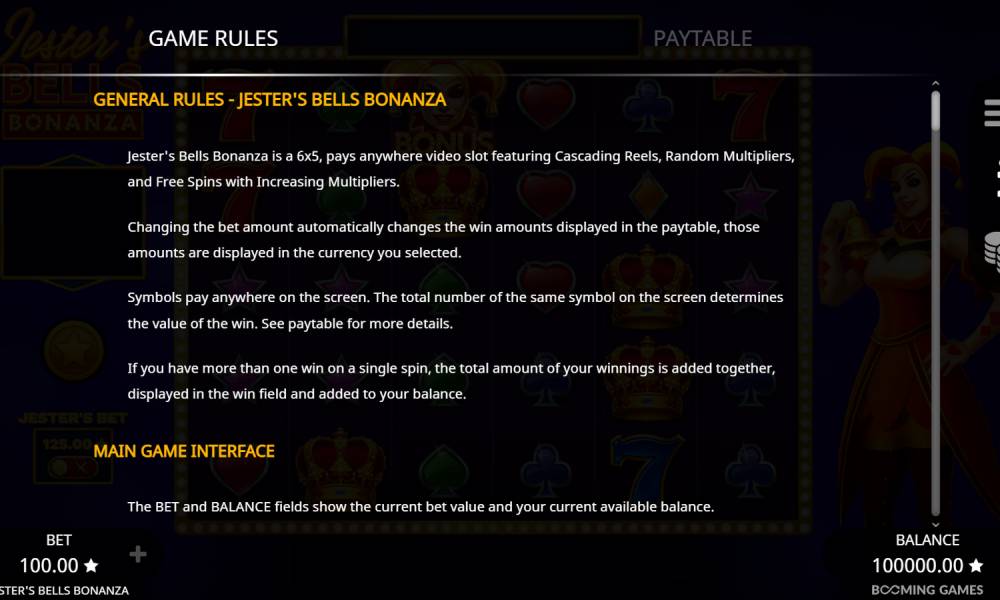 In Jester's Bells Bonanza, the gambler wins if 8+ identical symbols appear on the field (not counting Scatter - it pays for 4+). There are 5 rows on the 6 reels. There are 11 symbols involved, of which 9 are simple and 2 are special. Each win triggers a cascade. The signs that gave a payout - are removed, new ones fall in their place. The cascade continues as long as the field continues to form new payouts.