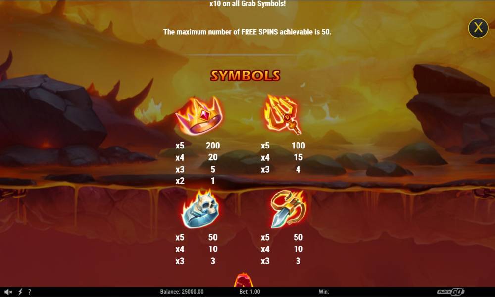 The player starts with 10 free spins, increasing up to 50 with the Retrigger and Collect the Fireball Feature. All wins are calculated using the table and then multiplied by the Multiplier of the current round.