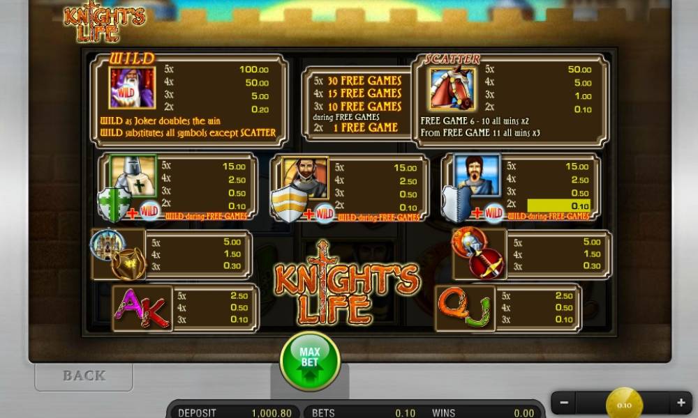 Knight’s Life is a five reeled video slot with five active lines, which quantity is impossible to change. An amount of the bet per each of the positions can be varied by the player in range from five cents to ten euro. This way, playing this slot machine is possible by the total bet in range from twenty five cents to fifty euro per spin.