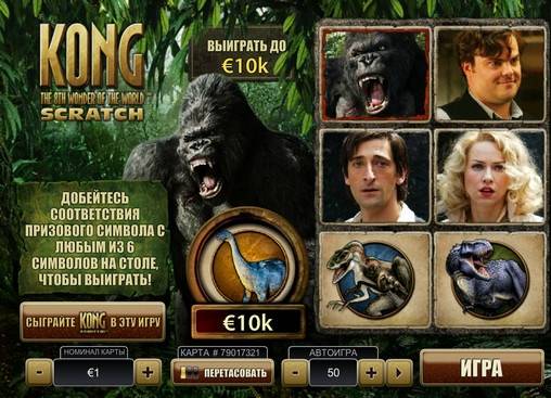 One of the best online casinos that offer a scratch card called Kong - The 8th Wonder of the World Scratch is Europa Casino. Users can play it both for real money and for fun. The game is also available at other online casinos running on software released by Playtech.