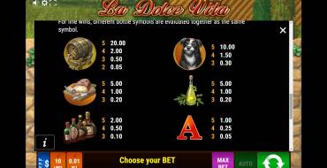 you will to play in La Dolce Vita against the backdrop of the sights of sunny Italy. The stylistics of the slot is easy and pleasant, the developers have paid attention to detail, including detailed drawing of each symbol. Symbols are easy to interpret, which is essential for users with little gaming experience. However, the classics of slot machines are also represented here - the traditional symbolsof 10, Q, K and A. In addition, the player will have to deal with a house, bottles of wine, oil and bread and sausage. In addition, there is a dog, which, according to the story, should guard the winery. There is also the owner of all this goodness - the winemaker.