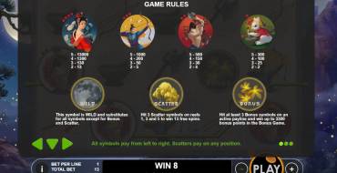 The gaming symbols, imaged at the reels of «Lady of the Moon» video slot, are a girl in red kimono, an archer, a warrior with an axe, a white rabbit, a mortar, a bow and arrows, an axe and a cudgel. These are the basic symbols.