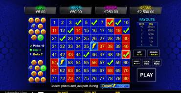 The playing field is represented by 8×10 squares with numbers from 1 to 80. The bet on one number in the round can be from 0.5 to 62.5. The player has to choose from three to ten random digits himself or give the choice to the computer with the "Quick Pick" button. The amount of winnings depends on how many digits played (a total of 20 variants fall out at the top), because depending on this applies a multiplier (up to x2500). View the values can be found in the slot menu in the payout table.