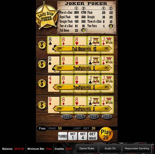 Lucky Draw Joker Poker is a video poker with a standard 52-card deck with a joker. All cards are shuffled at the beginning of each dealing.
