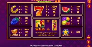 The Lucky Joker 10 Cashpins slot machine from the Amatic provider has a standard playing field, consisting of 5 reels with 3 symbols. Payouts are made on 10 fixed pay lines, the number of which you can’t change.
