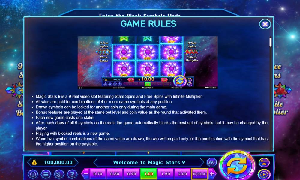 There is no 100% winning strategy in the Magic Stars 9 as the gameplay is based on chance. However, players can use different betting systems to control their budget. For example, changing the volatility level allows you to customize the game to your own style.
