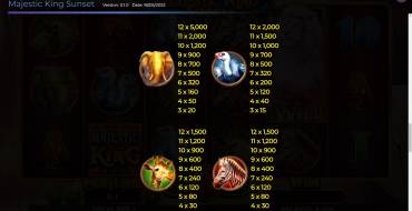 Animals are the main theme of the Majestic King Sunset slot machine from the Spinomenal provider. If you are lucky you can get large prizes, up to 5,000 bets.