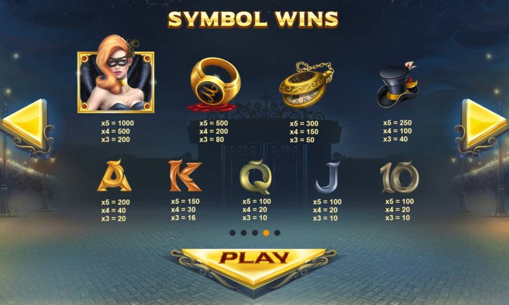The gaming symbols, imaged at the reels of «Masquerade» slot machine, are playing cards, a cylinder hat, watches on chain, a ring and a red-haired girl in a mask. All icons are imaged in vertical stacks at the reels.