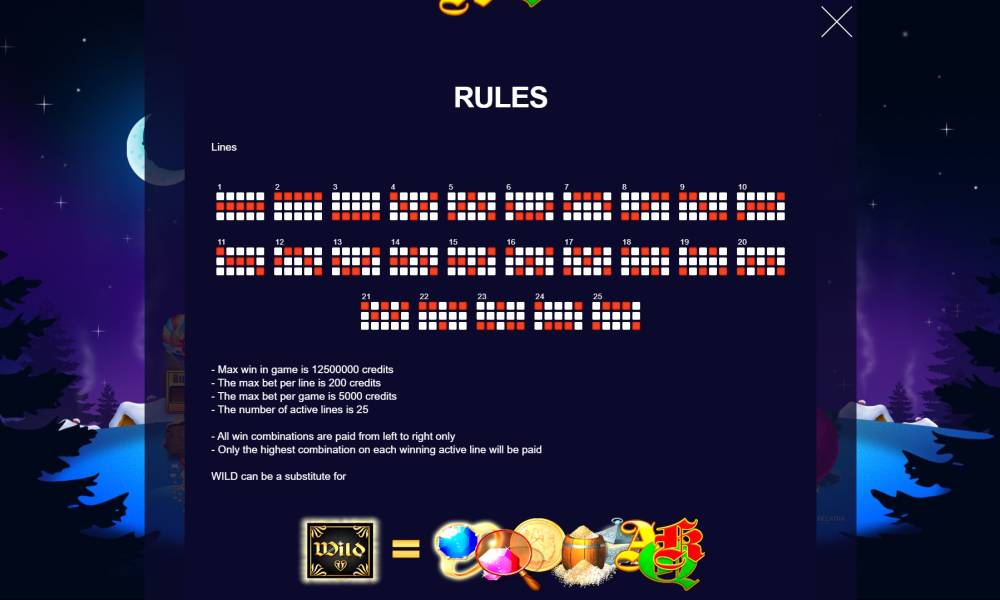 The Master of Xmas slot machine from the Belatra provider has a 5x3 playing field. All payouts are made on 25 fixed lines.