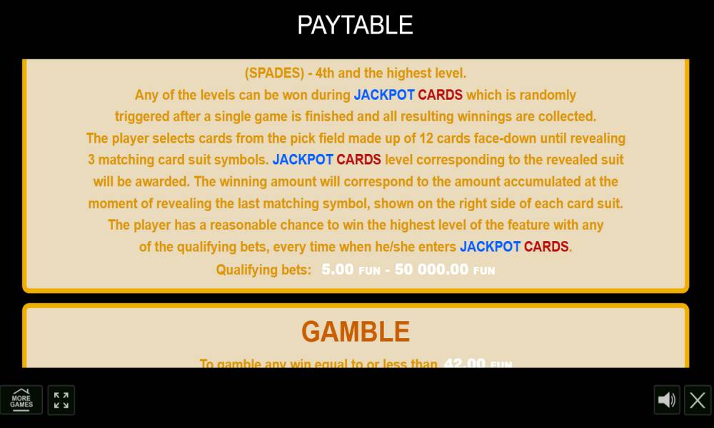 The playing field consists of 5 reels, each with 4 rows. All symbols on them make combinations from left to right on 40 fixed lines. For payment you need 3-5 identical symbols. In total, the game involves 4 senior and 6 junior signs. Online slot bonuses are represented by special symbols and additional rounds (Jackpot Cards, Gamble, Free Spins). The range of bets allows you to choose different amounts from 0.01 to 1000 euros per spin. Count users can count on the maximum prize x1000.