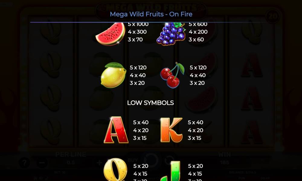 The playing field in the Mega Wild Fruits - On Fire consists of 5 reels. Each of them has a height of 4 cells. 20 fixed lines are responsible for building combinations. To win you need 3+ identical symbols in a row, from the left edge to the right edge. The bet range from 0.2 to 200 euros, which is very good with a maximum stake of x3000. The slot features free spins, random bonuses and extra spins. The main gameplay is built around the Wild symbol. The slot uses 2 special and 8 regular symbols.