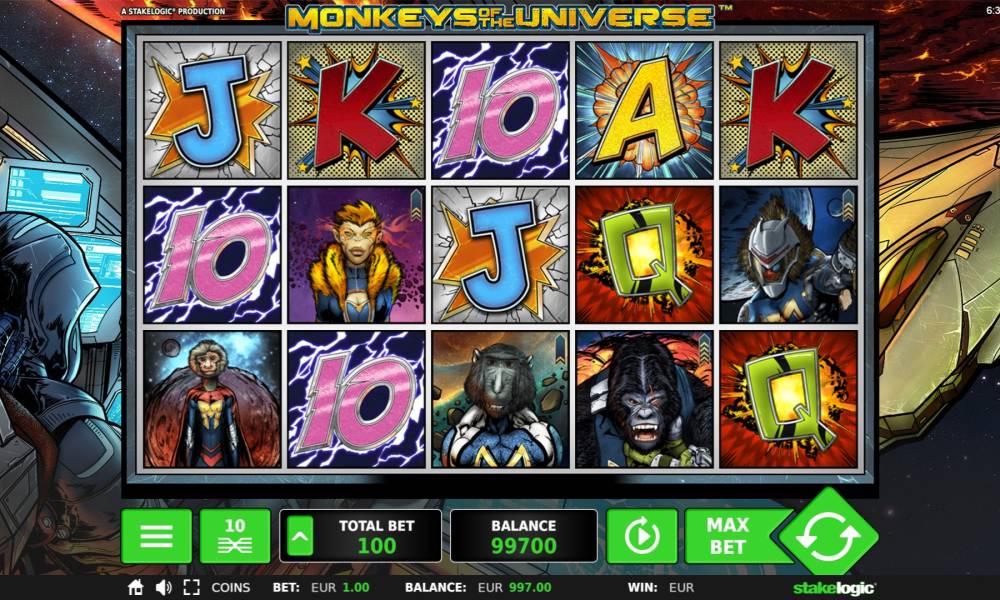 The developers of StakeLogic company are far not the first who had an idea to create a video slot about funny monkeys traveling in open space. Such slot machines have been already presented in the online casinos powered by software of diverse brands. However we recommend you to pay your attention to the game named «Monkeys of the Universe», which this review by Casinoz is devoted to, because it has unique features of the gameplay and some other advantages.