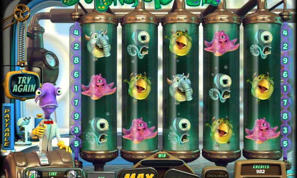 There are eight standard gaming symbols, which you would see at the screen of Monster Lab slot machine, which are images of funny monsters and three special. The special elements are Wild (you can recognize it by title), Scatter (a red molecule) and Bonus (a horned creature with a snout). Their difference to the basic elements are described below: