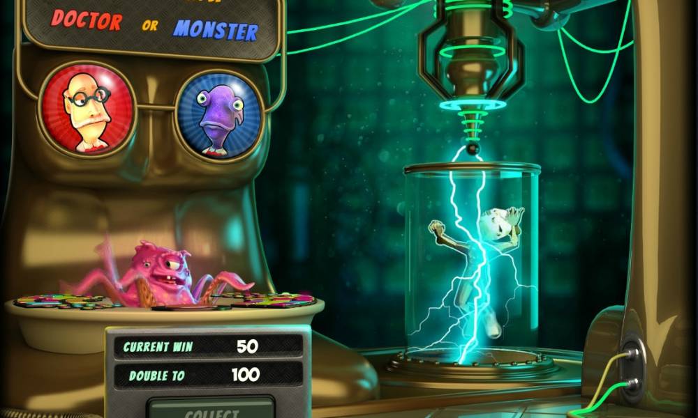 This round is designed in the style, which answers the general topic of the video slot. You would find yourself in the laboratory, where you would have to take part in the experiment. You aim is to guess the result of the chemistry test: the professor or the monster. If you answer correctly, your payoff would be doubled up. However, if you make a mistake, you lose you money. It is possible to play several times running.