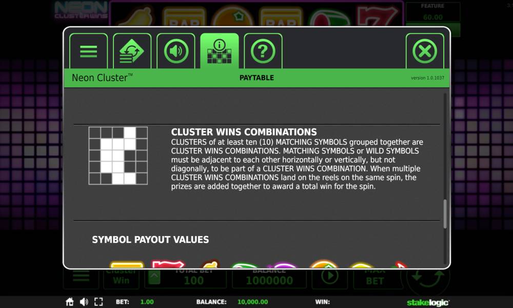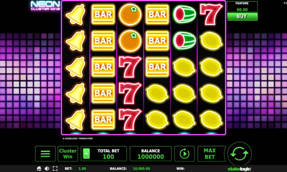 The Neon Cluster Wins slot machine from the provider Spinomenal is dedicated to a classic theme, which is reproduced in neon. The payout system is unusual, and it will allow you to win big prizes, up to 3,250 bets!