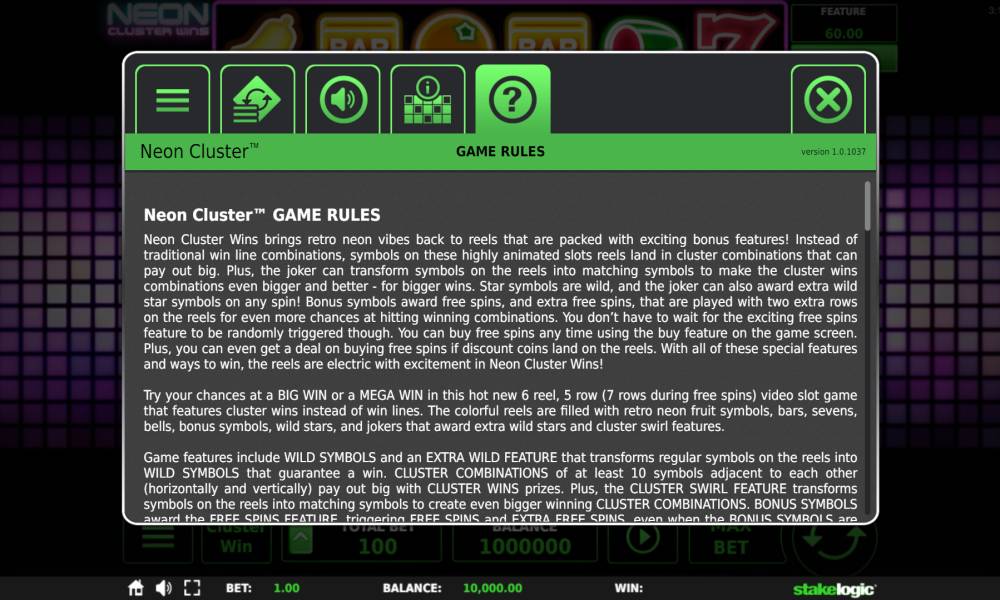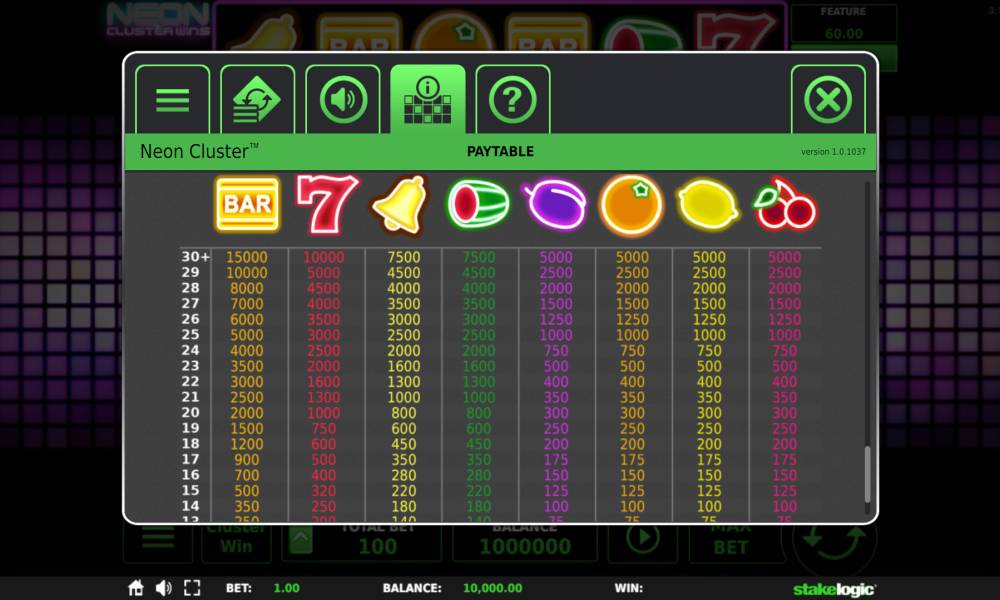 Try the Neon Cluster Wins slot from the provider Spinomenal on our Casinoz site for free. We also have a mobile version available, which will launch when you play from your smartphone or tablet.
