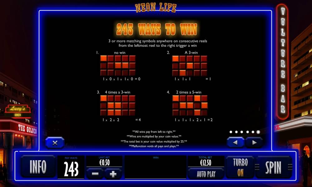The Neon Life slot has 243 lines.