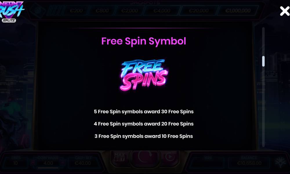 You need to hit from 5 to 10 special symbols on the screen in order to win one of the jackpots. 5 symbols will bring you the Rush Jackpot, 6 of them will hit the Neon Jackpot, etc.