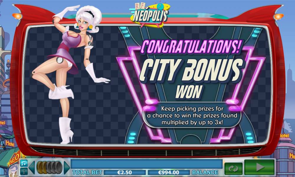 Neopolis Bonus – this round is available in four modes: Couples, Roulette, City and Robot Factory. They are triggered randomly.